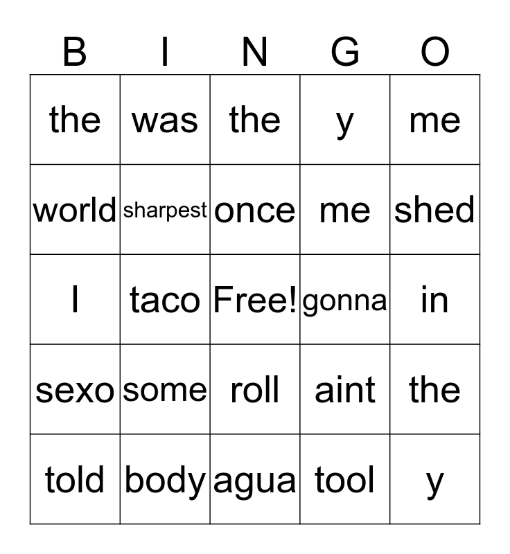 This bingo card has a free space and 24 words: some, body, once, told, me, the, world, was, gonna, roll, me, I, aint, the, sharpest, tool, in, the, shed, taco, y, sexo, y and agua.