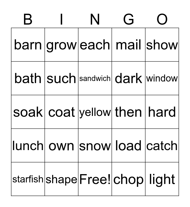 This bingo card has 25 words: lunch, shape, yellow, chop, show, barn, grow, each, then, catch, bath, such, Free!, load, window, starfish, coat, sandwich, dark, hard, soak, own, snow, mail and light.