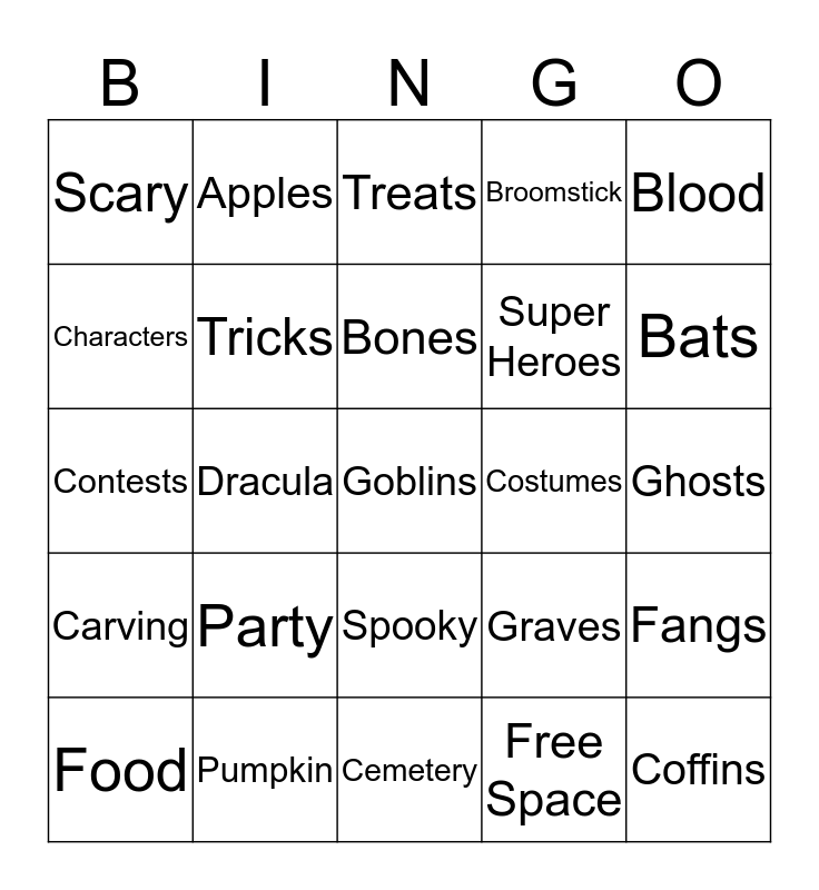 This bingo card has 30 words: Pumpkin, Candy, Dracula, Jack O Lantern, Scary, Treats, Tricks, Spooky, Costumes, Cemetery, Ghosts, Goblins, Free Space, Coffins, Bats, Spider Webs, Graves, Carving, Party, Blood, Contests, Darkness, Apples, Super Heroes, Characters, Broomstick, Fangs, Food, Bones and Witch.