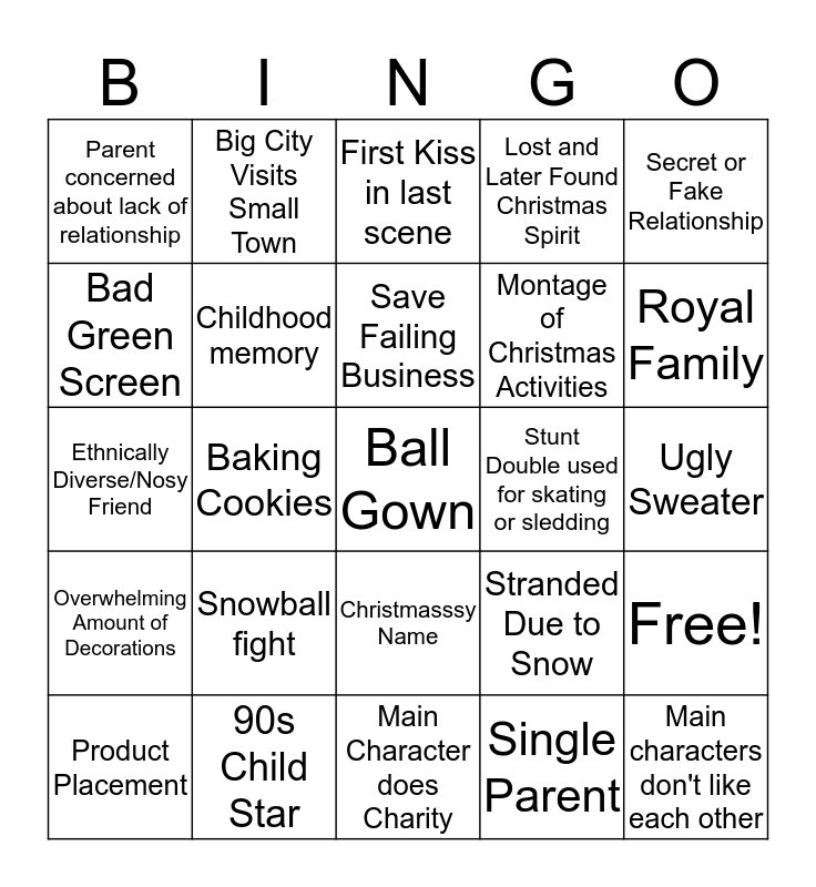 This bingo card has 26 words: Christmasssy Name, Single Parent, Save Failing Business, 90s Child Star, Secret or Fake Relationship, Parent concerned about lack of relationship, Bad Green Screen, Big City Visits Small Town, Ugly Sweater, Stranded Due to Snow, Montage of Christmas Activities, Ethnically Diverse/Nosy Friend, Free!, Product Placement, Baking Cookies, Obnoxious Rich GF or BF, Lost and Later Found Christmas Spirit, Overwhelming Amount of Decorations, First Kiss in last scene, Ball Gown, Royal Family, Main Character does Charity, Stunt Double used for skating or sledding, Snowball fight, Childhood memory and Main characters don't like each other.