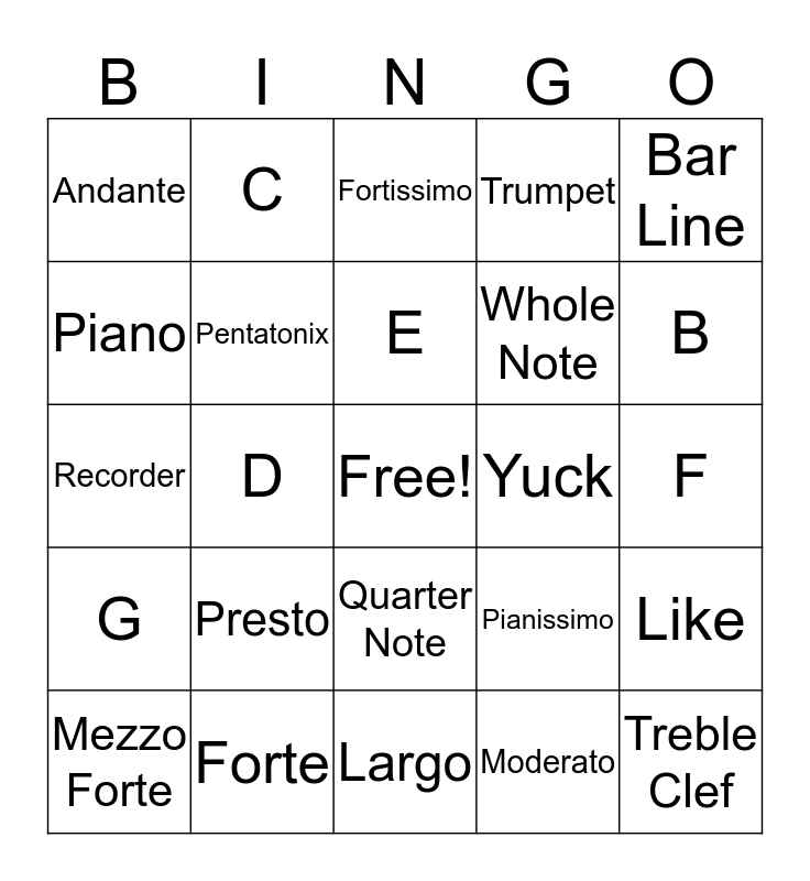 This bingo card has a free space and 29 words: Mezzo Forte, Staff, D, Acappella, Andante, Fortissimo, Pentatonix, Presto, Yuck, Forte, F, Treble Clef, Largo, Moderato, B, A, Quarter Note, G, Bar Line, Recorder, Pianissimo, Half Note, Whole Note, Piano, Trumpet, C, Like, E and Allegro.