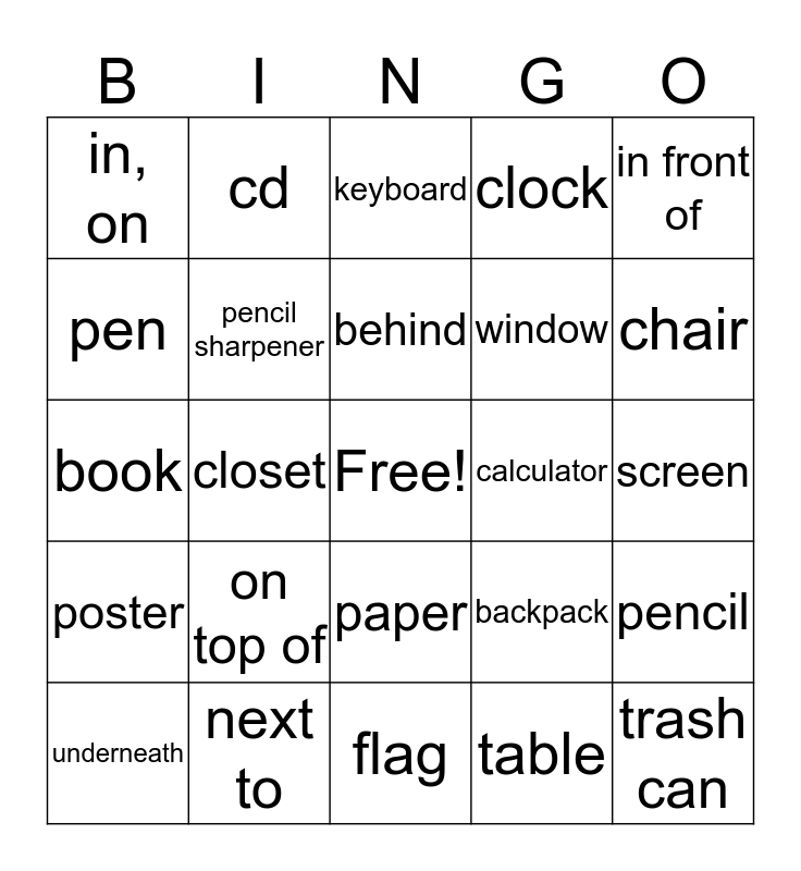 This bingo card has a free space and 24 words: on top of, next to, behind, underneath, in front of, in, on, pen, cd, calculator, paper, window, book, backpack, pencil, pencil sharpener, table, screen, keyboard, chair, closet, trash can, poster, clock and flag.