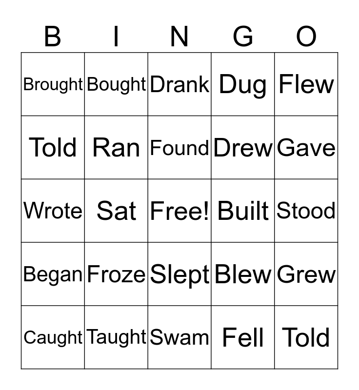 This bingo card has a free space and 34 words: Swept, Fell, Drove, Fed, Began, Ran, Flew, Caught, Bought, Thought, Found, Drank, Spoke, Ate, Built, Gave, Taught, Wrote, Froze, Blew, Slept, Rang, Brought, Stood, Swam, Told, Dug, Rode, Drew, Told, Came, Sat, Grew and Said.