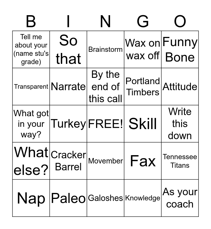 This bingo card has a free space and 24 words: Cracker Barrel, Paleo, By the end of this call, Nap, Funny Bone, Tell me about your (name stu's grade), Transparent, So that, Skill, Movember, Portland Timbers, What got in your way?, Fax, Tennessee Titans, Narrate, Knowledge, Write this down, Brainstorm, Attitude, Turkey, As your coach, What else?, Wax on wax off and Galoshes.