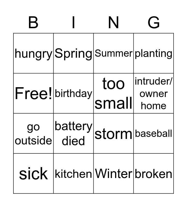 This bingo card has 16 words: kitchen, baseball, Summer, hungry, go outside, Spring, storm, Winter, Free!, birthday, sick, planting, battery died, intruder/ owner home, too small and broken.