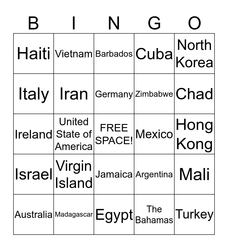 This bingo card has a free space and 24 words: Virgin Island, Madagascar, Germany, Australia, North Korea, Haiti, Italy, Vietnam, Mexico, Jamaica, Zimbabwe, Ireland, Argentina, Mali, Iran, The Bahamas, Hong Kong, Barbados, Chad, United State of America, Turkey, Israel, Cuba and Egypt.