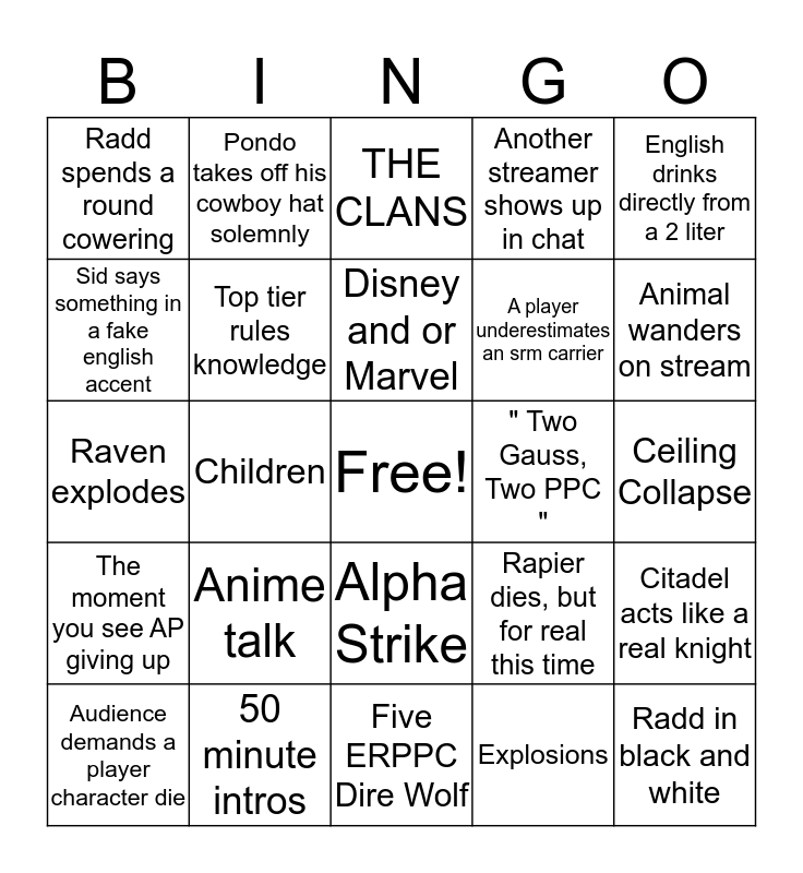 This bingo card has a free space and 24 words: Anime talk, 50 minute intros, Disney and or Marvel, Audience demands a player character die, English drinks directly from a 2 liter, Radd spends a round cowering, Sid says something in a fake english accent, Pondo takes off his cowboy hat solemnly, " Two Gauss, Two PPC ", Alpha Strike, A player underestimates an srm carrier, Raven explodes, Rapier dies, but for real this time, Citadel acts like a real knight, Top tier rules knowledge, Explosions, Ceiling Collapse, THE CLANS, Animal wanders on stream, Children, Radd in black and white, The moment you see AP giving up, Another streamer shows up in chat and Five ERPPC Dire Wolf.
