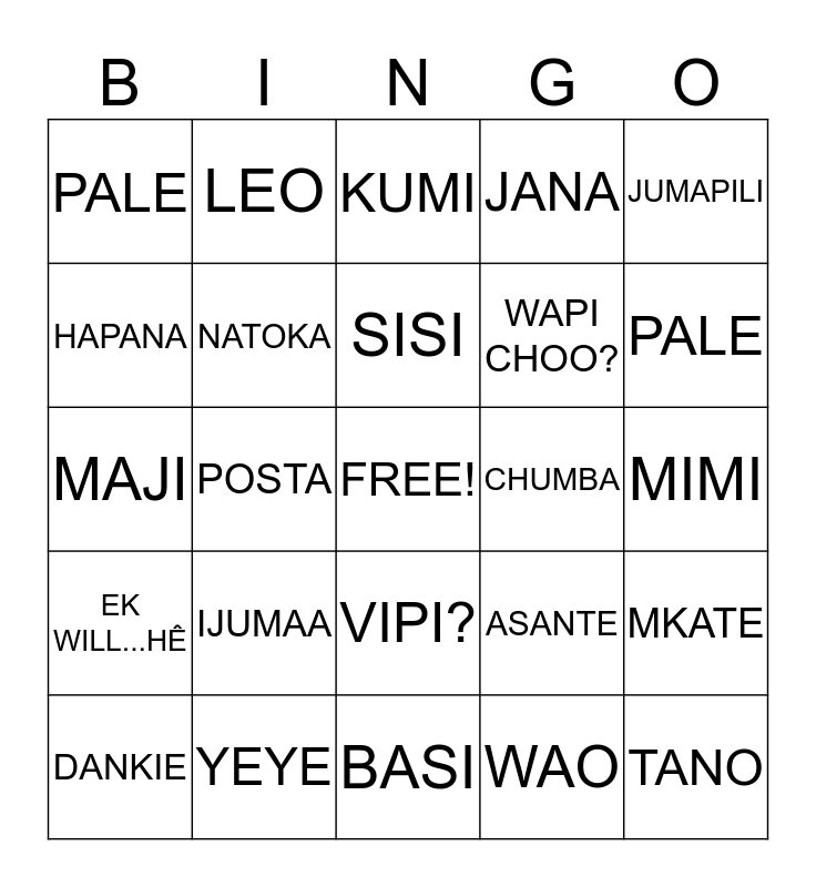 This bingo card has a free space and 24 words: IJUMAA, YEYE, SISI, DANKIE, JUMAPILI, PALE, HAPANA, LEO, CHUMBA, VIPI?, WAPI CHOO?, MAJI, ASANTE, MKATE, NATOKA, WAO, MIMI, KUMI, PALE, POSTA, TANO, EK WILL...HÊ, JANA and BASI.