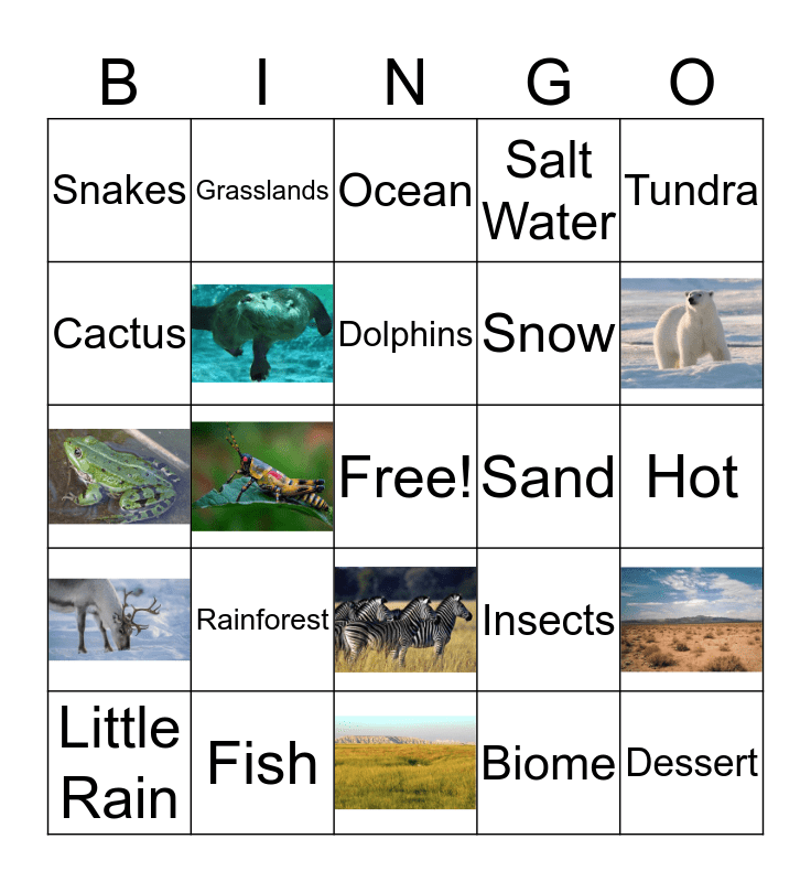 This bingo card has 8 images, a free space and 16 words: Rainforest, Fish, Dolphins, Little Rain, Tundra, Snakes, Cactus, Grasslands, Sand, Snow, Insects, Biome, Hot, Ocean, Dessert and Salt Water.