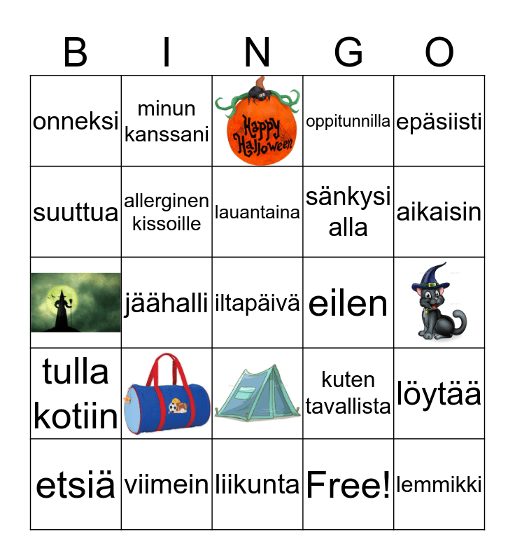 This bingo card has 7 images and 23 words: viimein, lainata, jäähalli, hulluna koiriin, onneksi, allerginen kissoille, eilen, liikunta, iltapäivä, Free!, lemmikki, aikaisin, kuten tavallista, tulla kotiin, epäsiisti, minun kanssani, sänkysi alla, suuttua, oppitunnilla, löytää, etsiä, lauantaina and Teet minut hulluksi!.