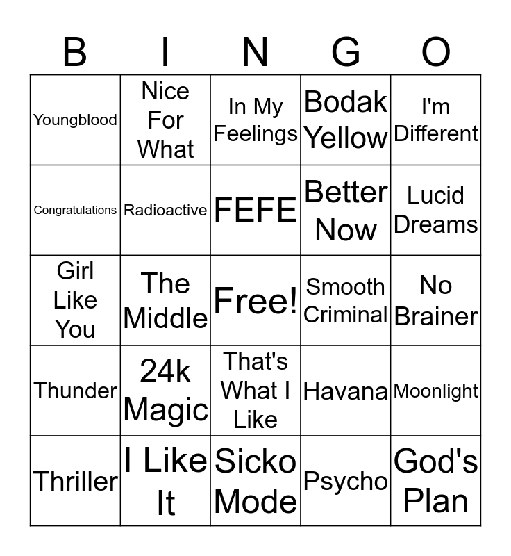 This bingo card has a free space and 28 words: Moonlight, SAD, Better Now, Psycho, Congratulations, In My Feelings, Nice For What, Thunder, Smooth Criminal, Thriller, Girl Like You, Bodak Yellow, I Like It, Sicko Mode, Lucid Dreams, Happy, 24k Magic, Radioactive, FEFE, That's What I Like, Youngblood, Believer, God's Plan, The Middle, No Brainer, Havana, I'm Different and What Do You Mean.