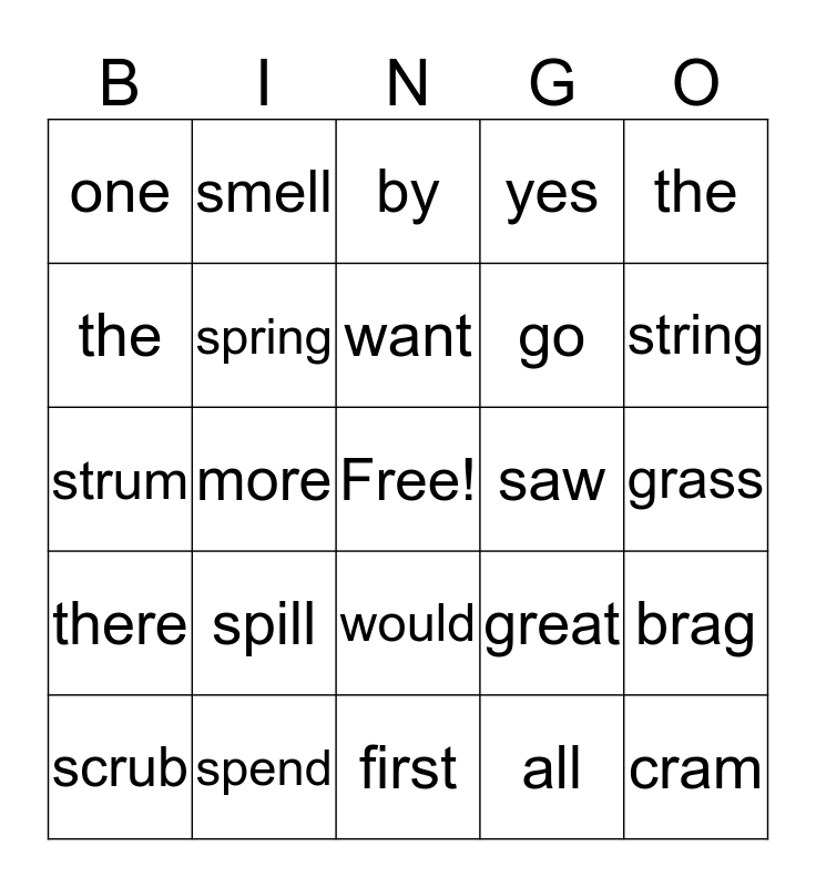 This bingo card has a free space and 24 words: spill, spend, want, scrub, the, one, the, smell, saw, would, go, strum, great, brag, spring, all, grass, by, string, more, cram, there, yes and first.