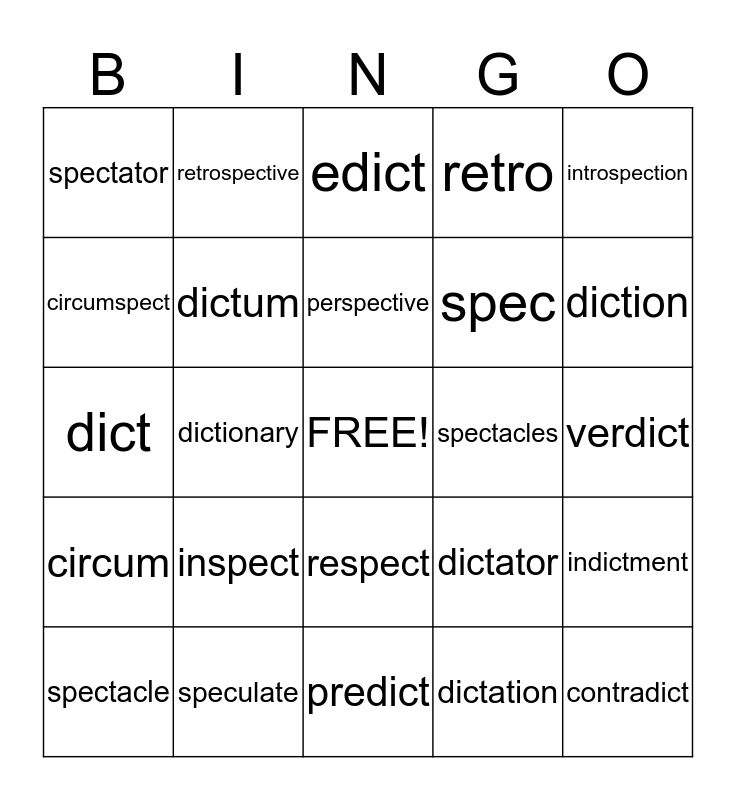 This bingo card has a free space and 24 words: inspect, speculate, perspective, spectacle, introspection, spectator, circumspect, retrospective, spectacles, respect, spec, dict, dictator, indictment, dictum, dictation, verdict, edict, diction, dictionary, contradict, circum, retro and predict.