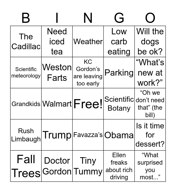 This bingo card has a free space and 29 words: Fall Trees, Crazy Traffic, Walmart, Wine, The Cadillac, Weather, Weston Farts, Trump, Scientific Botany, Doctor Gordon, “Oh we don’t need that” (the bill), “What surprised you most...”, Tiny Tummy, Ellen freaks about rich driving, “What’s new at work?”, Road Kill, Favazza’s, Rush Limbaugh, Will the dogs be ok?, Grandkids, Obama, Sports, Parking, Scientific meteorology, Low carb eating, Need iced tea, Is it time for dessert?, KC Gordon’s are leaving too early and What are we doing for Xmas?.