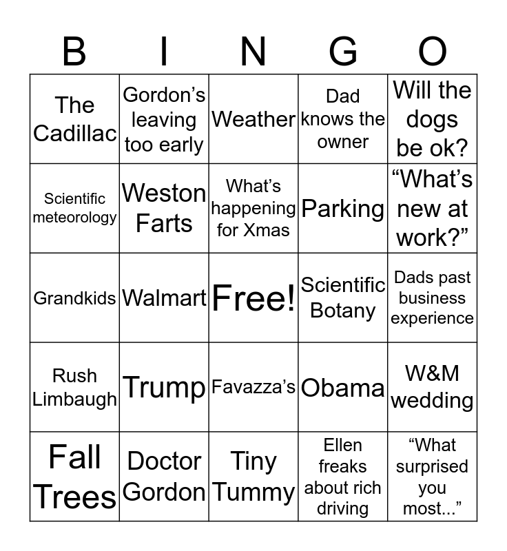 This bingo card has a free space and 29 words: Fall Trees, Crazy Traffic, Walmart, Wine, The Cadillac, Weather, Weston Farts, Trump, Scientific Botany, Doctor Gordon, Dads past business experience, “What surprised you most...”, Tiny Tummy, Ellen freaks about rich driving, “What’s new at work?”, Road Kill, Favazza’s, Rush Limbaugh, Will the dogs be ok?, Grandkids, Obama, Sports, Parking, Scientific meteorology, Dad knows the owner, Gordon’s leaving too early, W&M wedding, What’s happening for Xmas and Mom’s family.