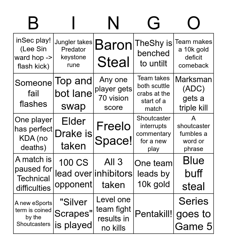This bingo card has a free space and 42 words: Red buff steal, Any one player gets 70 vision score, A shoutcaster loses their voice momentarily, 100 CS lead over opponent, Pentakill!, Blue buff steal, Series goes to Game 5, One team leads by 7.5k gold, Baron Steal, All 3 inhibitors taken, A shoutcaster fumbles a word or phrase, Marksman (ADC) gets a triple kill, Elder Drake is taken, Team makes a 10k gold deficit comeback, Level one first blood, One team leads by 10k gold, Kai'sa is picked, One player has perfect KDA (no deaths), Someone uses an eSports team skin, Jungler takes Predator keystone rune, Someone fail flashes, One team gets Aced!, Laners get a solo kill (2v2 kill for botlane), inSec play! (Lee Sin ward hop -> flash kick), A shoutcaster screams so loud, they drown out the crowd, Viktor is picked for play in the Top lane, Team takes both scuttle crabs at the start of a match, A player fails a flash, The crowd starts a random "TSM" chant, Justin shows up to Worlds, Reckless win MVP, A match is paused for Technical difficulties, Top and bot lane swap, Level one team fight results in no kills, A Comcast/Xfinity ad is played, A new eSports term is coined by the Shoutcasters, "Silver Scrapes" is played, Shoutcaster interrupts commentary for a new play, Riot pulls some Augmented reality magic again, A player on the stage is shown picking their nose, TheShy is benched to untilt and Soaz subbed in for Bwipo.