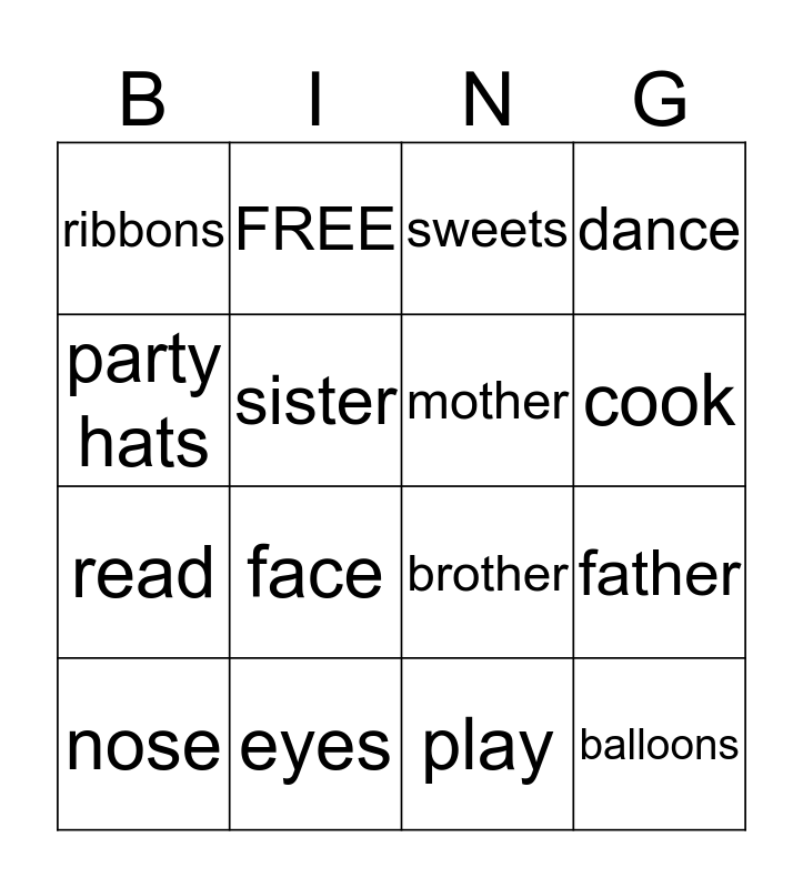 This bingo card has 16 words: eyes, father, sweets, ribbons, read, FREE, brother, play, party hats, sister, nose, dance, face, cook, mother and balloons.