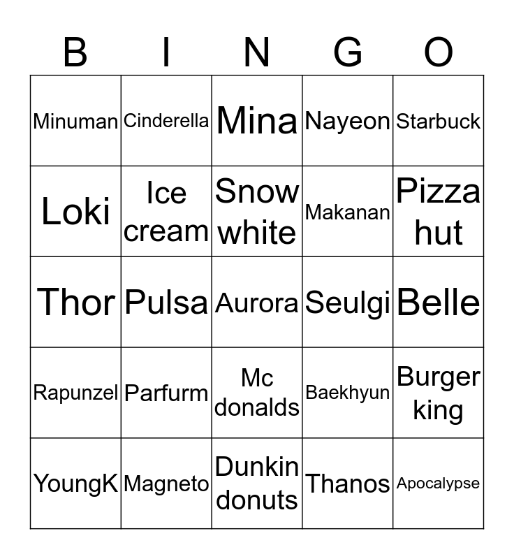 This bingo card has a free space and 24 words: Parfurm, Magneto, Snow white, YoungK, Starbuck, Minuman, Loki, Cinderella, Seulgi, Mc donalds, Makanan, Thor, Baekhyun, Burger king, Ice cream, Thanos, Belle, Mina, Pizza hut, Pulsa, Apocalypse, Rapunzel, Nayeon and Dunkin donuts.