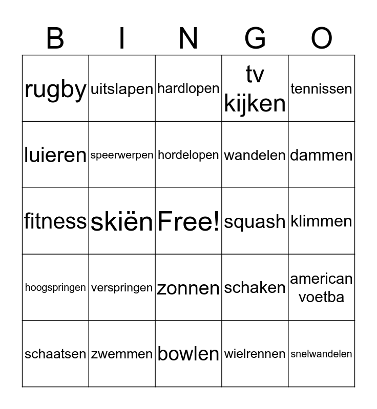 This bingo card has a free space and 29 words: atletiek, zwemmen, hardlopen, voetballen, tennissen, rugby, speerwerpen, hordelopen, squash, american voetba, schaatsen, skiën, wielrennen, snelwandelen, fitness, bobsleen, bowlen, schaken, dammen, hoogspringen, verspringen, triatlon, wandelen, klimmen, luieren, uitslapen, zonnen, tv kijken and film kijken.