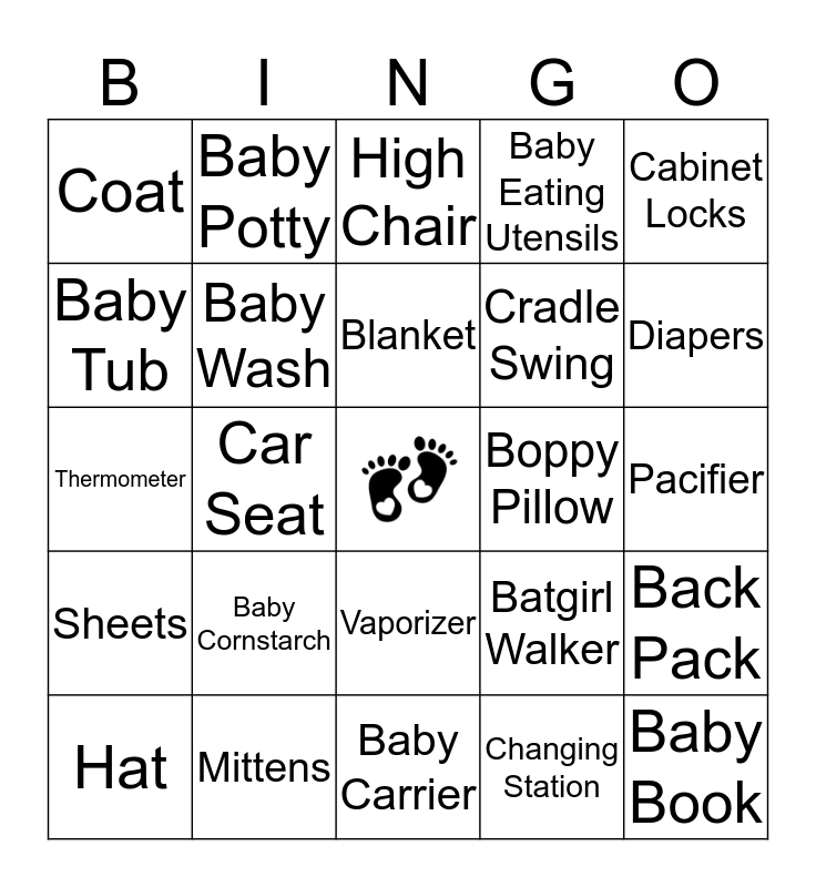 This bingo card has a free space and 51 words: Activity Gym, Baby Book, Baby Bottles, Baby Carrier, Baby Cornstarch, Baby Monitor, Baby Potty, Baby Shampoo, Baby Tub, Baby Tylenol, Baby Wash, Baby Eating Utensils, Back Pack, Batgirl Walker, Batman Dish, Bibs, Blanket, Boppy Pillow, Burp Cloths, Cabinet Locks, Car Seat, Changing Station, Coat, Cradle Swing, Desitin, Diaper Genie, Diapers, Gift Card, Hat, High Chair, Hooded Towel, Humidifier, Jogger Stroller, Lamp, Learning Table, Mittens, Mobile, Nursery Care Kit, On Board Sign, Onesies, Pacifier, Sheets, Sippy Cup, Snot Sucker, Socks, Teether, Thermometer, Tub Spout Cover, Umbrella Stroller, Vaporizer and Baby Wipes.