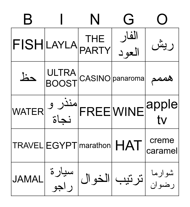 This bingo card has a free space and 24 words: EGYPT, سيارة راجو, CASINO, JAMAL, ريش, FISH, حظ, LAYLA, WINE, marathon, panaroma, WATER, HAT, creme caramel, ULTRA BOOST, ترتيب, apple tv, THE PARTY, هممم, منذر و نجاة, شوارما رضوان, TRAVEL, الفار العود and الخوال.