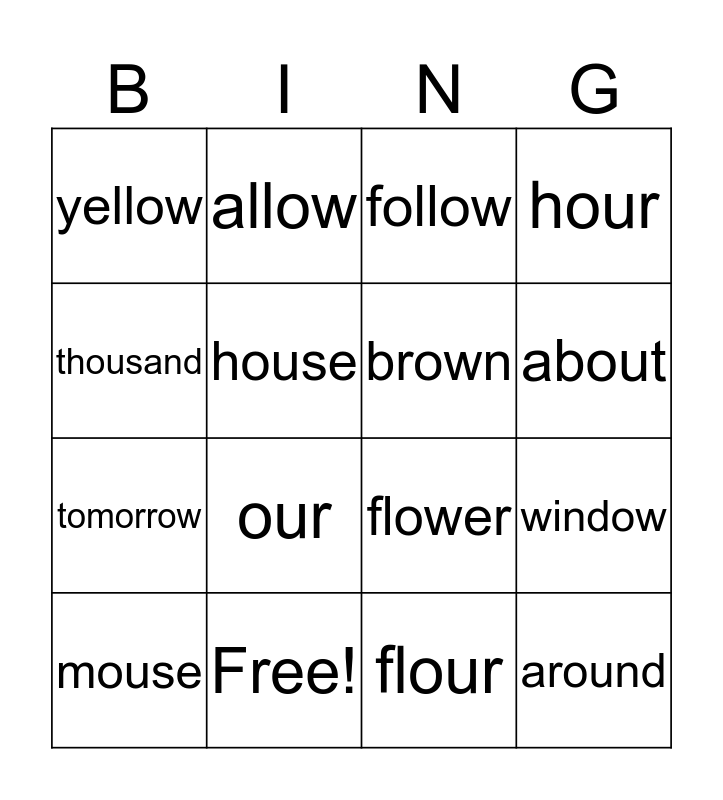 This bingo card has 16 words: Free!, window, follow, yellow, tomorrow, allow, flower, flour, thousand, house, mouse, hour, our, about, brown and around.