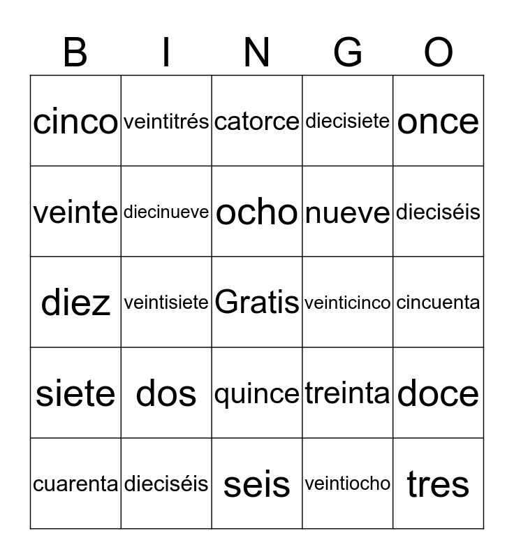 This bingo card has a free space and 24 words: dos, dieciséis, ocho, cuarenta, once, cinco, veinte, veintitrés, veinticinco, quince, nueve, diez, treinta, doce, diecinueve, veintiocho, cincuenta, catorce, dieciséis, veintisiete, tres, siete, diecisiete and seis.