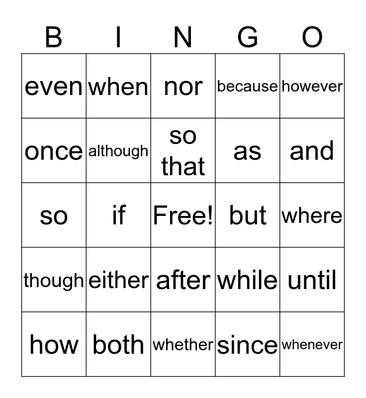 This bingo card has a free space and 24 words: how, either, so that, since, however, even, when, nor, but, where, so, although, while, until, once, both, whether, because, and, though, if, after, as and whenever.