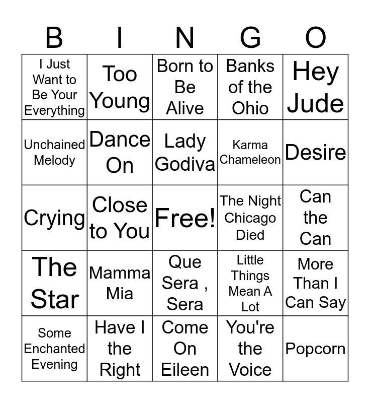This bingo card has a free space and 41 words: It's Now or Never, Crying, The Swiss Maid, Dance On, Have I the Right, Que Sera , Sera, Lady Godiva, The Last Waltz, Hey Jude, The Star, Close to You, Banks of the Ohio, Popcorn, Can the Can, The Night Chicago Died, Mamma Mia, Let's Stick Together, I Just Want to Be Your Everything, Three Times A Lady, Born to Be Alive, More Than I Can Say, You Weren't In Love With Me, Come On Eileen, Karma Chameleon, I Just Called To Say I Love You, I Got You Babe, You're the Voice, La Bamba, Desire, Swing The Mood, Quicksilver, Too Young, Some Enchanted Evening, I'm Walking Behind You, Little Things Mean A Lot, Unchained Melody, Whatever Will Be Will Be, Around the World (In Eighty Days), Volare, I'll Never Fall In Love Again and Smoke Gets In Your Eyes.