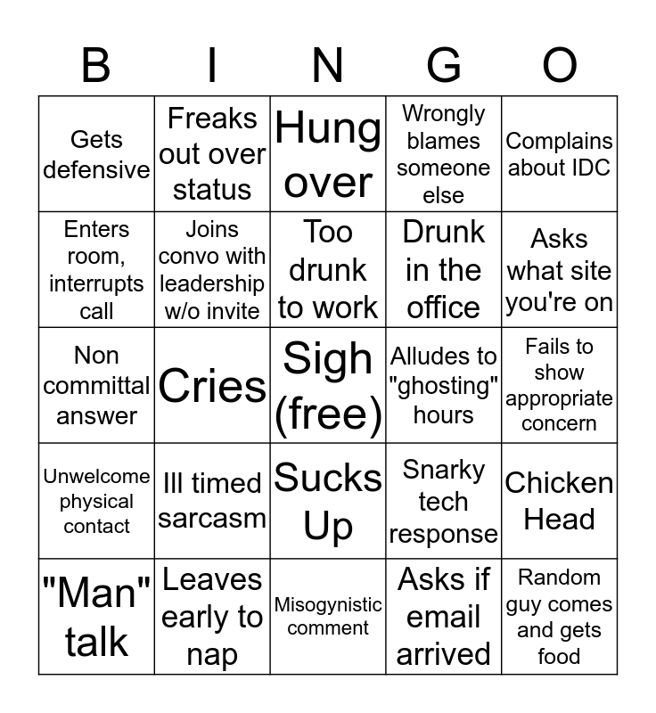 This bingo card has a free space and 39 words: Defends the terrible actions of others, Yells at someone else in the room, Gripes about not using TFS, Joins convo with leadership w/o invite, "Man" talk, Sucks Up, Too drunk to work, Not listening, info needs repeating, Complains about IDC, Unwelcome physical contact, Cries, Wrongly blames someone else, Random guy comes and gets food, Fails to show appropriate concern, Alludes to "ghosting" hours, Ill timed sarcasm, Uses military letters, Gets defensive, Makes excuses, Snarky tech response, Enters room, interrupts call, Misogynistic comment, Drunk in the office, Asks what site you're on, Anyone needs CPR, Redder than usual, TRUUCK!, Captain Obvious Comment, Talking to self, Freaks out over status, SPREAD SHEET!, All caps in an email, Hung over, Leaves early to nap, Asks if email arrived, Takes personal call in room, Chicken Head, Non committal answer and Interrupts call.