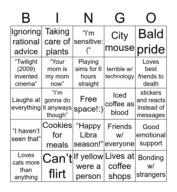This bingo card has a free space and 24 words: Cookies for meals, Can’t flirt, Playing sims for 6 hours straight, Loves cats more than anything, Bald pride, Ignoring rational advice, “Twilight (2009) invented cinema”, Taking care of plants, Iced coffee as blood, “Happy Libra season!”, terrible w/ technology, Laughs at everything, Friends w/ everyone, Good emotional support, “Your mom is my mom now”, Lives at coffee shops, stickers and reacts instead of messages, “I’m sensitive:(“, Loves best friends to death, “I’m gonna do it anyways though”, Bonding w/ strangers, “I haven’t seen that”, City mouse and If yellow were a person.