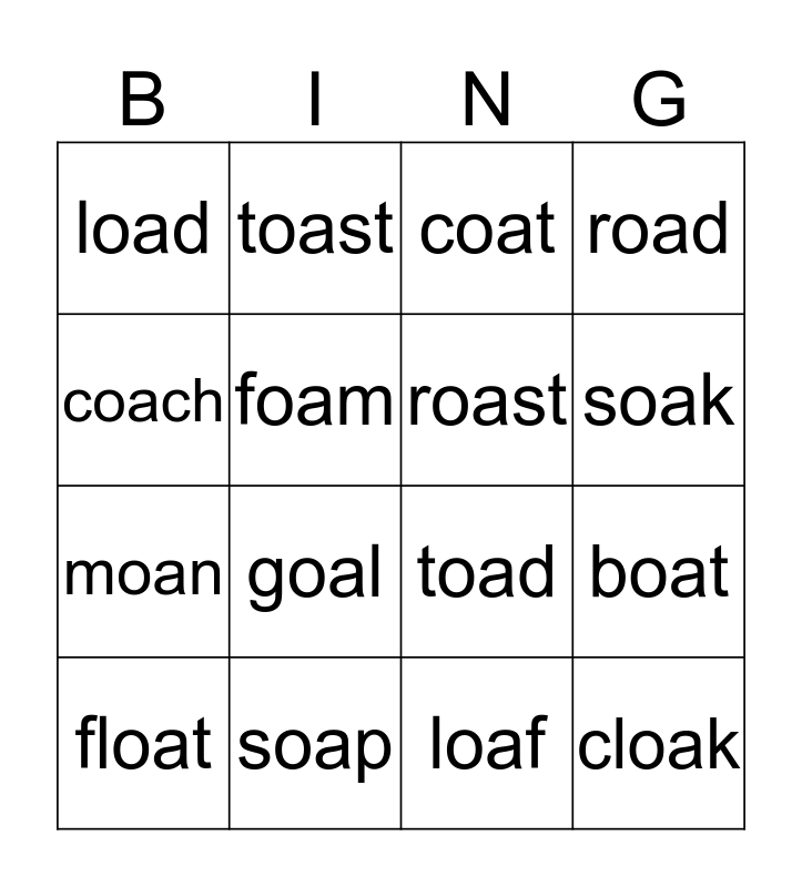 This bingo card has 16 words: soap, boat, coat, load, moan, toast, toad, loaf, coach, foam, float, road, goal, soak, roast and cloak.