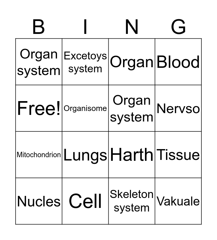 This bingo card has 16 words: Cell, Tissue, Organ, Organ system, Mitochondrion, Excetoys system, Harth, Skeleton system, Free!, Organisome, Nucles, Blood, Lungs, Nervso, Organ system and Vakuale.