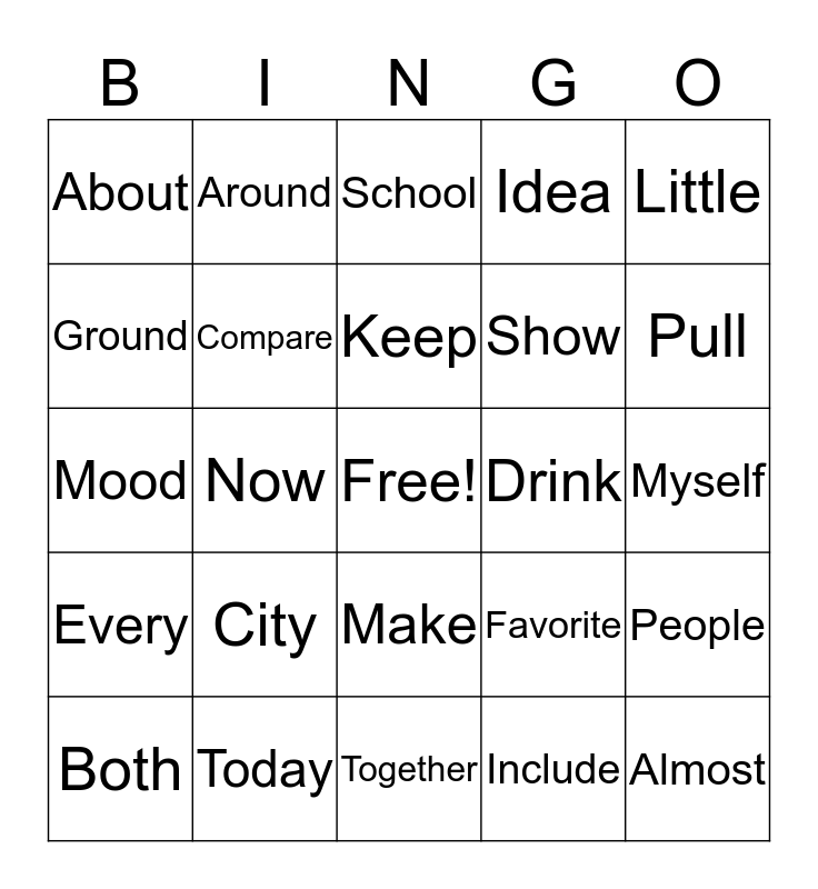 This bingo card has a free space and 24 words: City, Today, Keep, Both, Little, About, Ground, Around, Drink, Make, Show, Mood, Favorite, People, Compare, Include, Myself, School, Pull, Now, Almost, Every, Idea and Together.