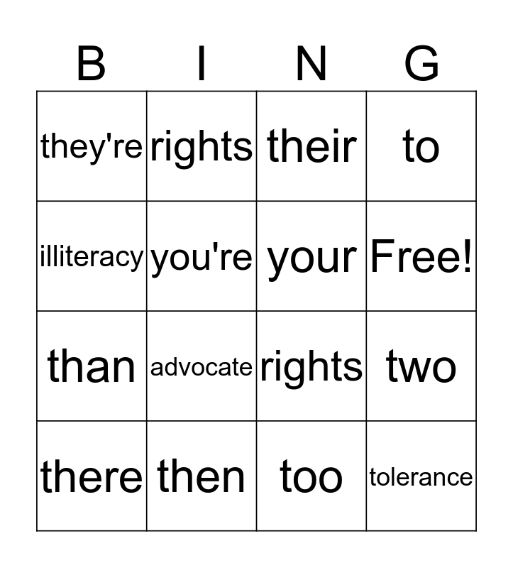 This bingo card has 17 words: too, there, their, they're, advocate, to, two, your, Free!, you're, then, rights, illiteracy, rights, than, dignity and tolerance.
