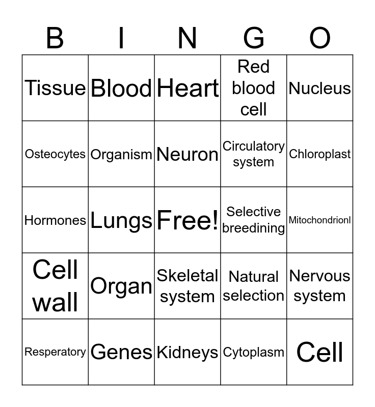 This bingo card has a free space and 24 words: Organ, Genes, Neuron, Resperatory, Nucleus, Tissue, Osteocytes, Blood, Selective breedining, Skeletal system, Circulatory system, Hormones, Natural selection, Nervous system, Organism, Cytoplasm, Mitochondrionl, Heart, Chloroplast, Lungs, Cell, Cell wall, Red blood cell and Kidneys.