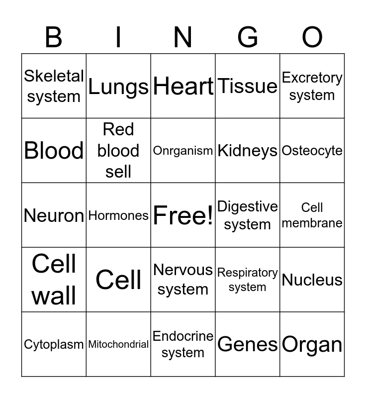 This bingo card has a free space and 24 words: Cell, Mitochondrial, Onrganism, Cytoplasm, Excretory system, Skeletal system, Blood, Lungs, Digestive system, Nervous system, Kidneys, Neuron, Respiratory system, Nucleus, Red blood sell, Genes, Cell membrane, Heart, Osteocyte, Hormones, Organ, Cell wall, Tissue and Endocrine system.