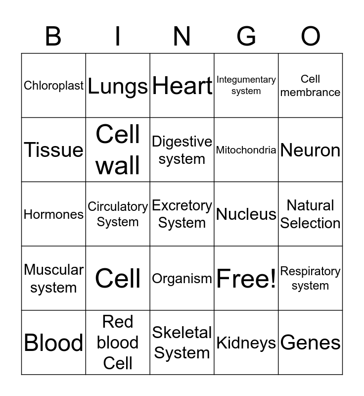 This bingo card has 25 words: Cell, Skeletal System, Digestive system, Blood, Cell membrance, Chloroplast, Tissue, Lungs, Nucleus, Organism, Mitochondria, Hormones, Free!, Respiratory system, Cell wall, Genes, Natural Selection, Heart, Neuron, Circulatory System, Excretory System, Red blood Cell, Muscular system, Integumentary system and Kidneys.