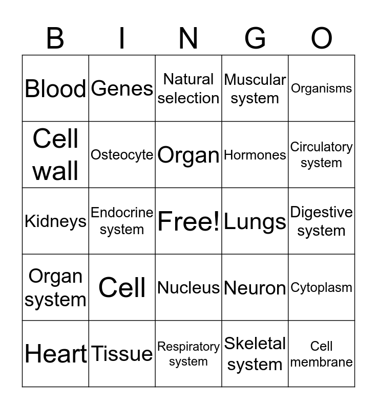This bingo card has a free space and 24 words: Cell, Tissue, Organ, Heart, Organisms, Blood, Cell wall, Genes, Lungs, Nucleus, Hormones, Kidneys, Neuron, Cytoplasm, Osteocyte, Skeletal system, Digestive system, Natural selection, Circulatory system, Endocrine system, Cell membrane, Organ system, Muscular system and Respiratory system.