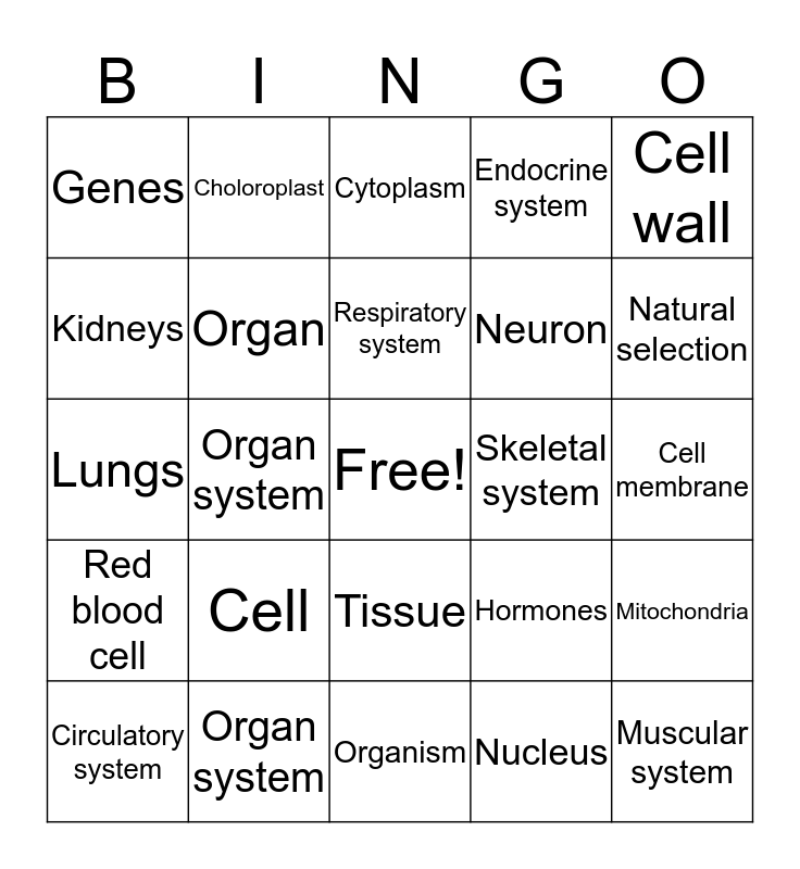 This bingo card has a free space and 24 words: Cell, Organ system, Respiratory system, Circulatory system, Cell wall, Genes, Kidneys, Choloroplast, Skeletal system, Tissue, Neuron, Lungs, Hormones, Mitochondria, Organ, Nucleus, Cell membrane, Cytoplasm, Natural selection, Organ system, Muscular system, Red blood cell, Endocrine system and Organism.