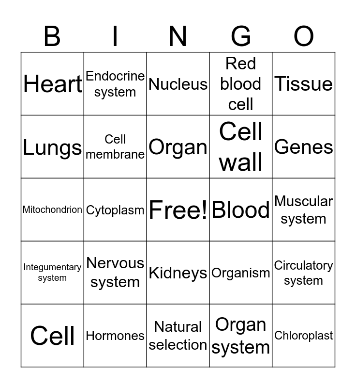 This bingo card has a free space and 24 words: Nervous system, Hormones, Organ, Cell, Tissue, Heart, Lungs, Endocrine system, Blood, Kidneys, Cell wall, Mitochondrion, Organism, Circulatory system, Cell membrane, Organ system, Muscular system, Nucleus, Genes, Cytoplasm, Chloroplast, Integumentary system, Red blood cell and Natural selection.