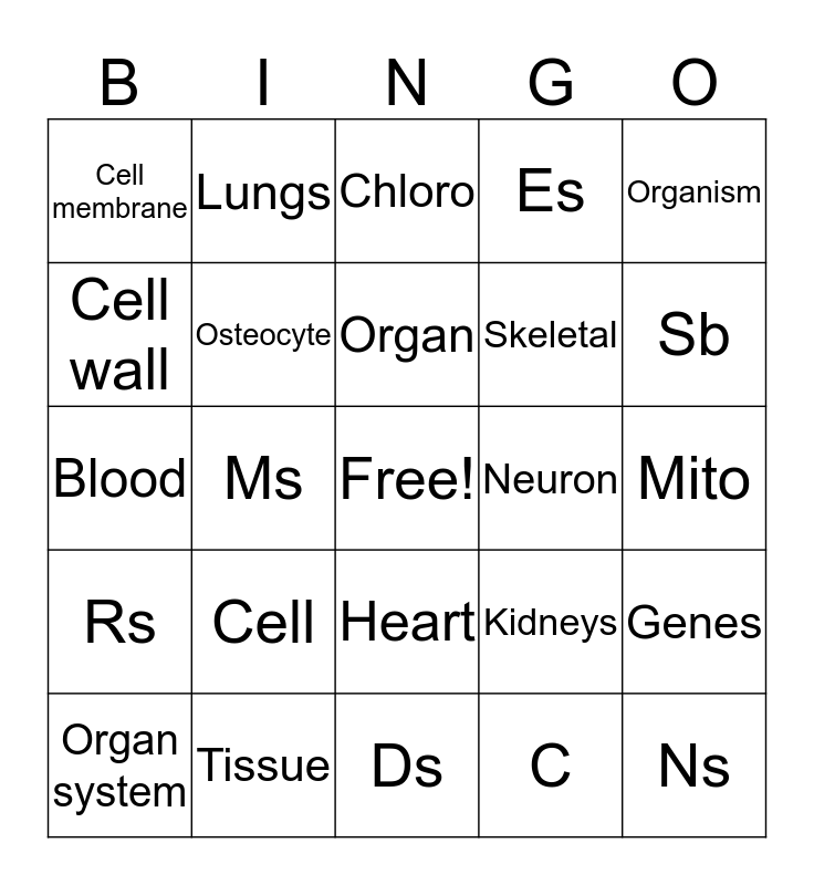 This bingo card has a free space and 24 words: Cell, Tissue, Organ, Organ system, Organism, Cell membrane, Cell wall, Lungs, Neuron, Heart, Skeletal, Blood, Kidneys, Genes, Osteocyte, C, Mito, Chloro, Sb, Ms, Ns, Rs, Es and Ds.
