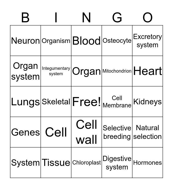 This bingo card has a free space and 24 words: Cell, Tissue, Organ, System, Excretory system, Neuron, Organ system, Organism, Cell Membrane, Cell wall, Mitochondrion, Lungs, Selective breeding, Natural selection, Integumentary system, Digestive system, Kidneys, Blood, Heart, Skeletal, Hormones, Genes, Osteocyte and Chloroplast.