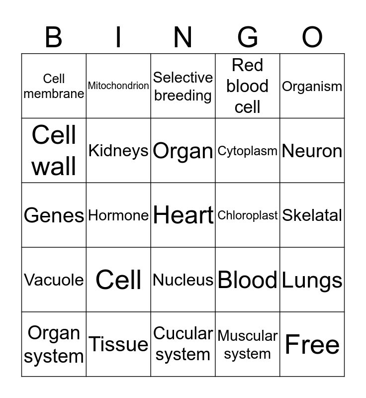 This bingo card has a free space and 24 words: Cell, Tissue, Organ, Organ system, Organism, Cell membrane, Cell wall, Mitochondrion, Chloroplast, Nucleus, Cytoplasm, Genes, Blood, Lungs, Kidneys, Muscular system, Skelatal, Selective breeding, Neuron, Hormone, Free, Vacuole, Red blood cell and Cucular system.