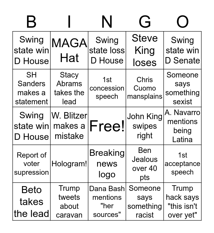 This bingo card has a free space and 29 words: Beto takes the lead, A. Cooper rolls his eyes, W. Blitzer makes a mistake, Toobin versus Santorum, Swing state win D House, Swing state loss D House, Stacy Abrams takes the lead, Hologram!, John King swipes right, Trump tweets about caravan, A. Navarro mentions being Latina, Trump hack says "this isn't over yet", Dana Bash mentions "her sources", Someone says something racist, Someone says something sexist, A. Gillum takes the lead, Breaking news logo, Report of voter supression, Swing state win D Senate, Swing state win D House, Ben Jealous over 40 pts, Don Lemon expresses disgust, Chris Cuomo mansplains, SH Sanders makes a statement, Steve King loses, MAGA Hat, 1st acceptance speech, 1st concession speech and Bernie and Elizabeth in same interview.