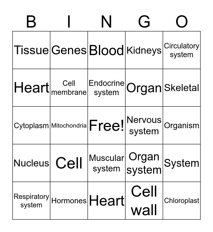 This bingo card has a free space and 24 words: Cell, Hormones, Endocrine system, Respiratory system, Circulatory system, Tissue, Heart, Genes, Nervous system, Muscular system, Organ, Cytoplasm, Organ system, System, Cell membrane, Cell wall, Organism, Blood, Skeletal, Mitochondria, Chloroplast, Nucleus, Kidneys and Heart.