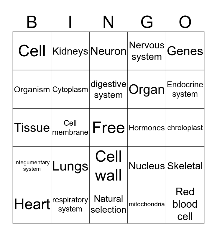 This bingo card has a free space and 24 words: Lungs, respiratory system, digestive system, Heart, Genes, Cell, Organism, Kidneys, Hormones, Cell wall, Organ, Tissue, Nucleus, Skeletal, Cytoplasm, mitochondria, chroloplast, Neuron, Endocrine system, Cell membrane, Red blood cell, Integumentary system, Nervous system and Natural selection.