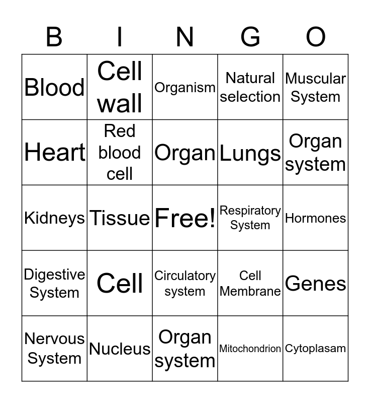 This bingo card has a free space and 24 words: Cell, Nucleus, Organ, Nervous System, Muscular System, Blood, Heart, Cell wall, Respiratory System, Circulatory system, Lungs, Kidneys, Cell Membrane, Genes, Red blood cell, Mitochondrion, Hormones, Organism, Organ system, Tissue, Cytoplasam, Digestive System, Natural selection and Organ system.