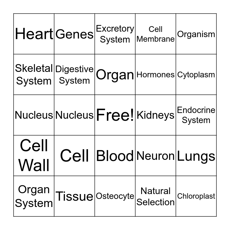 This bingo card has a free space and 24 words: Cell, Tissue, Organ, Organ System, Organism, Heart, Skeletal System, Genes, Kidneys, Blood, Hormones, Nucleus, Neuron, Lungs, Digestive System, Natural Selection, Endocrine System, Excretory System, Cytoplasm, Nucleus, Chloroplast, Cell Wall, Cell Membrane and Osteocyte.