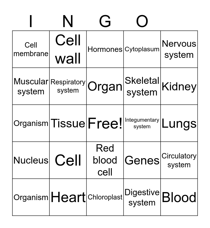 This bingo card has a free space and 24 words: Cell, Heart, Organ, Organism, Nervous system, Cell membrane, Muscular system, Cell wall, Integumentary system, Red blood cell, Skeletal system, Organism, Genes, Circulatory system, Respiratory system, Digestive system, Lungs, Hormones, Kidney, Tissue, Blood, Nucleus, Cytoplasum and Chloroplast.